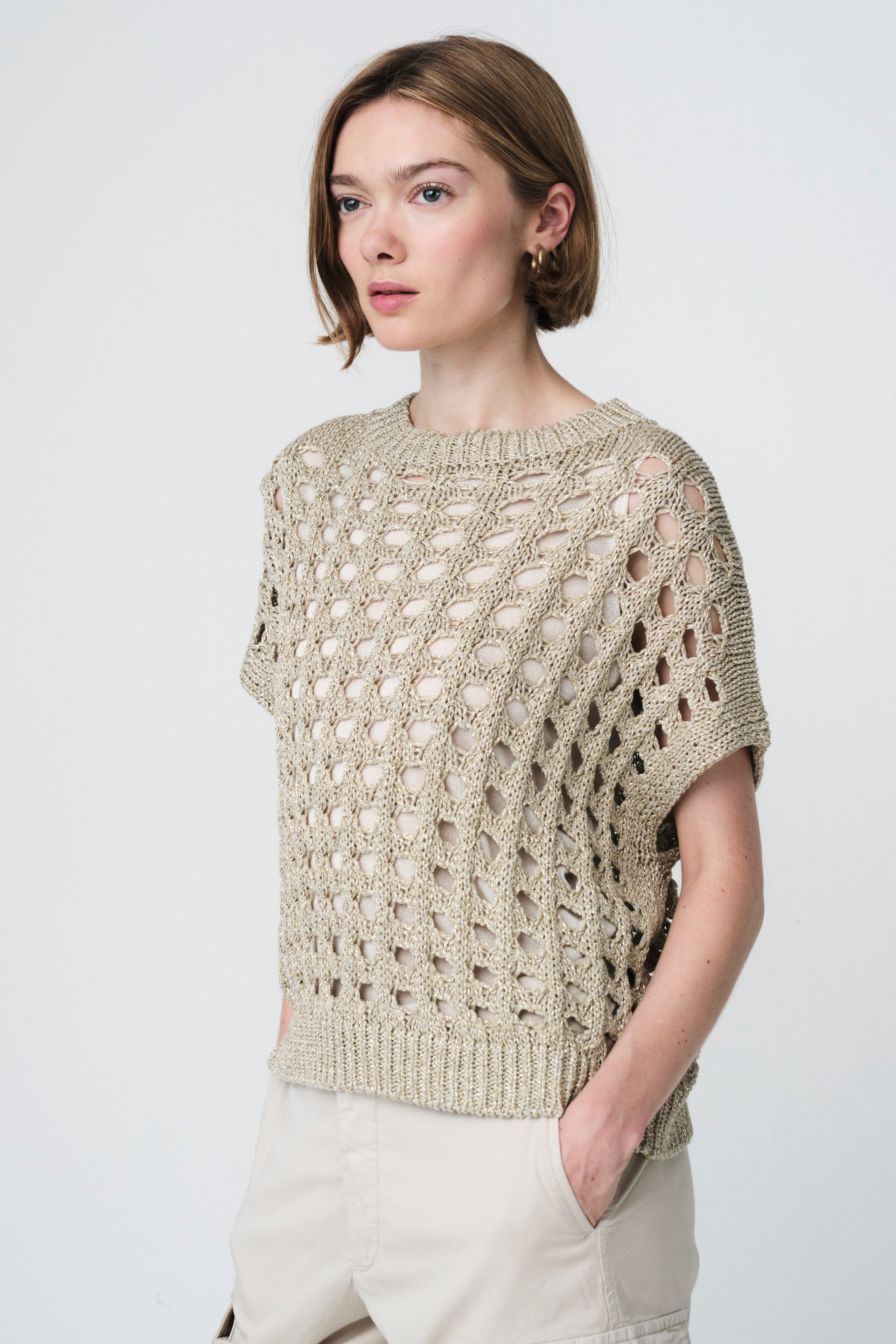 The Viscose Gold Vest by shines with understated elegance. Crafted in Europe from a soft viscose blend enriched with metallic fibers, this short-sleeved knit vest features an openwork structure that reflects light beautifully. The relaxed fit and subtle shimmer make it an effortless statement piece — perfect for both casual and chic summer looks.