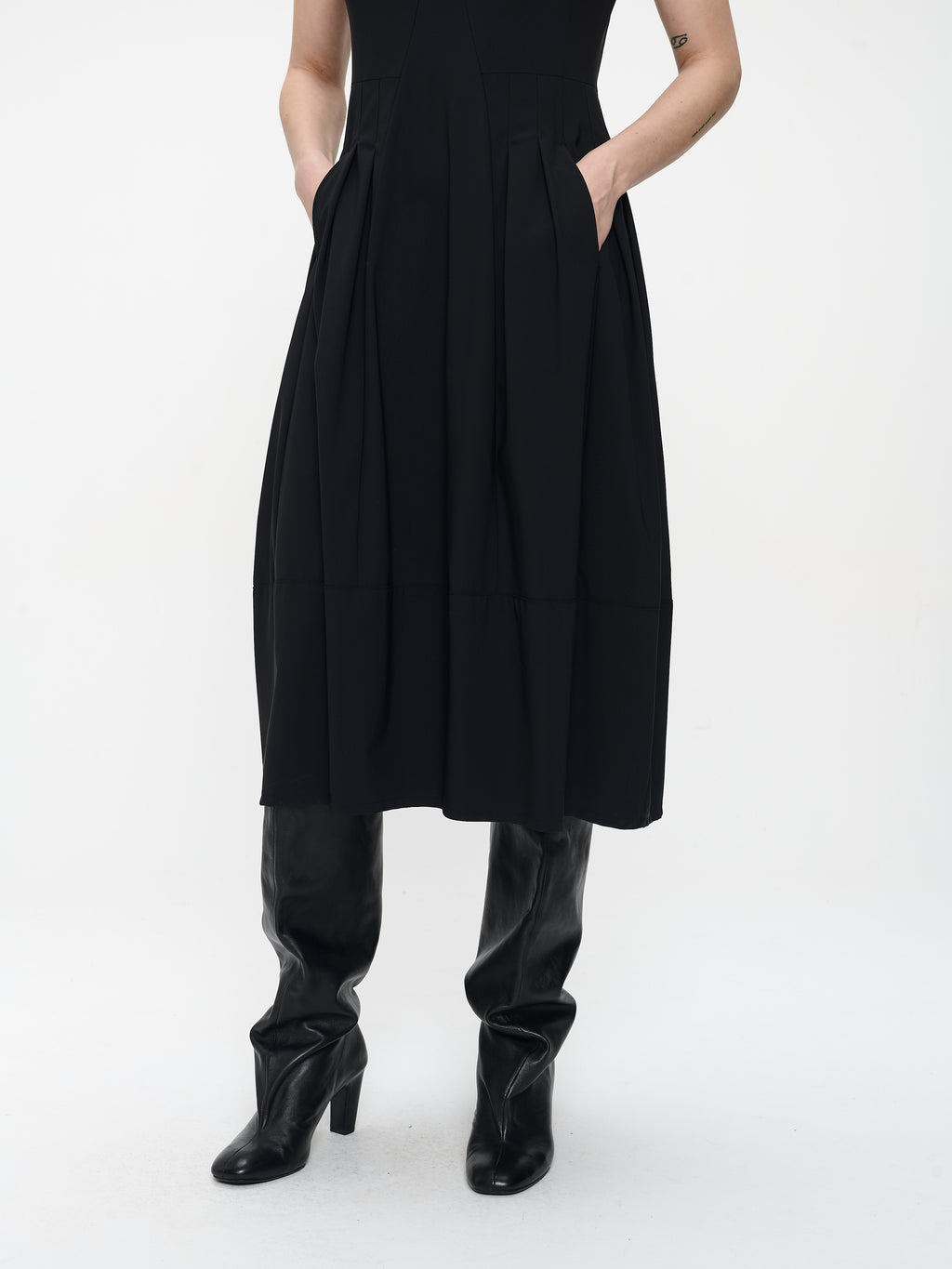 Elegant in its simplicity, this black Dress features a sleeveless silhouette with a round neckline and soft pleats that fall gracefully from the waist. Crafted from technical jersey, it offers fluid movement and everyday comfort while retaining a refined structure. The midi length and timeless shape make it perfect for both casual sophistication and elevated layering.