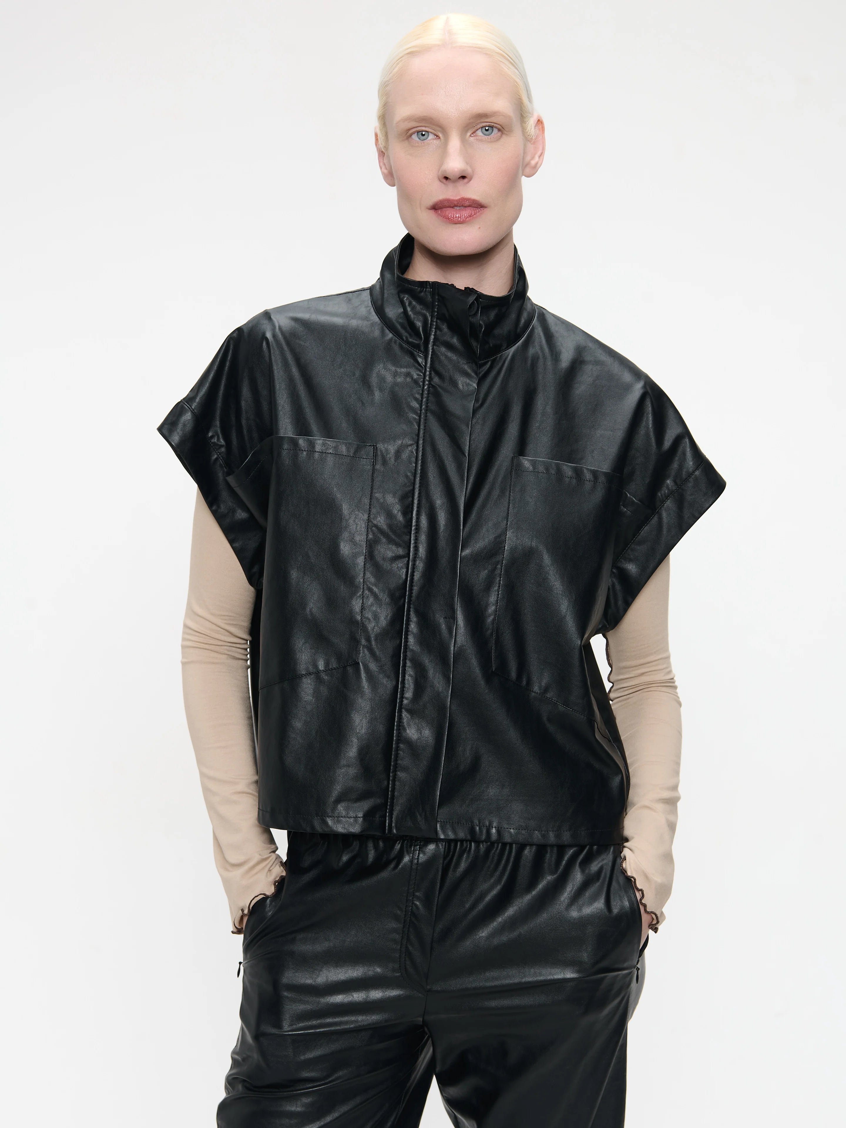 Add bold edge to your wardrobe with the Paola Eco Leather Blouse. This sleeveless design features a high stand collar, snap-button front, and a subtle boxy silhouette. Crafted from soft eco leather (100% viscose base), it delivers both structure and ease. Layered or worn solo, this piece brings a modern touch to casual or dressy looks.