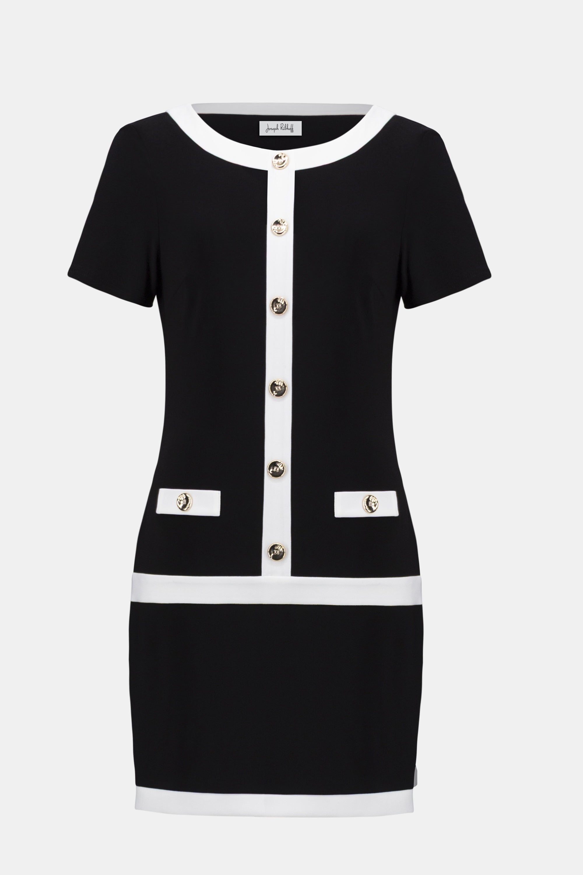 Effortlessly chic, this silky knit sheath dress features clean lines with vanilla contrast trim and polished gold button accents. A refined essential with a modern, minimalist edge.
