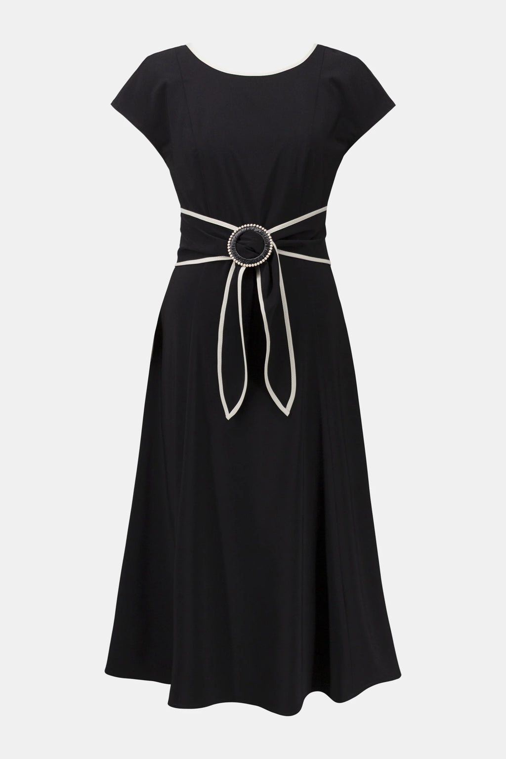 Sleek and defined, this stretch woven dress features contrast trim, short dolman sleeves, and a sash belt with buckle detail that cinches the waist just right.