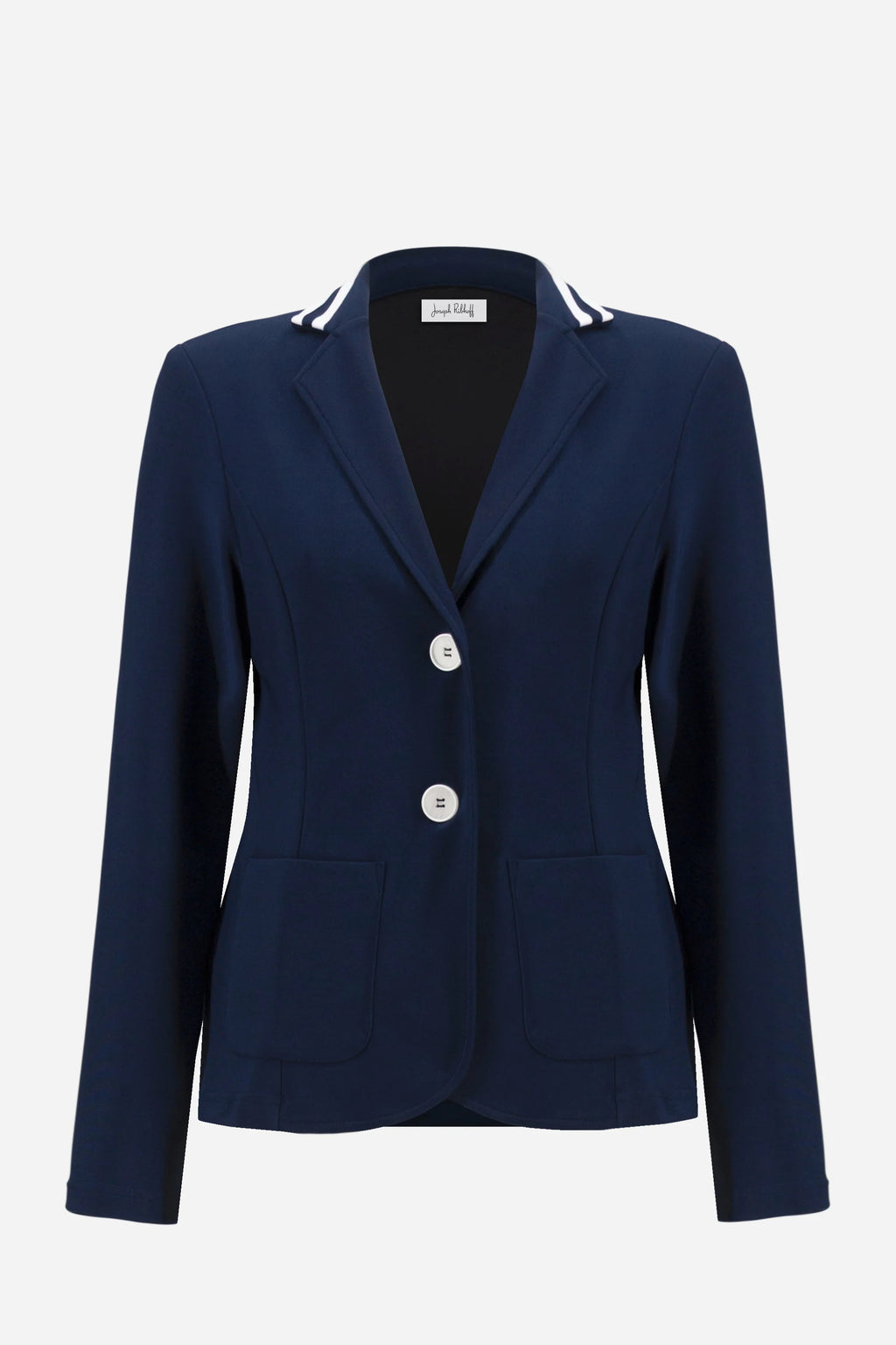 A tailored essential with a sporty edge. This silky knit blazer plays with contrast through its striped band accent, while princess seams shape the silhouette for a refined finish.