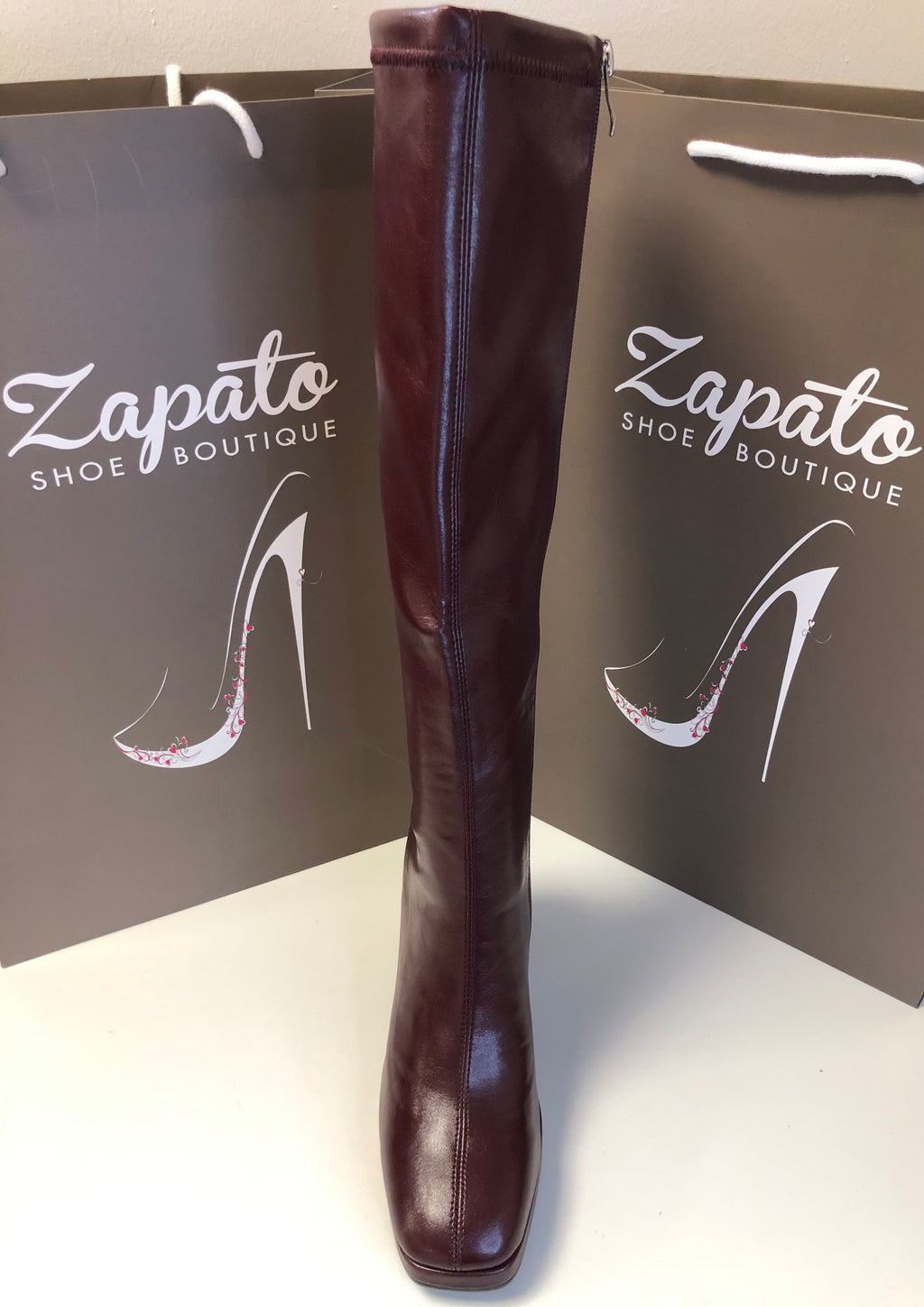 This fabulous knee-high boot comes in a gorgeous burgundy leather.