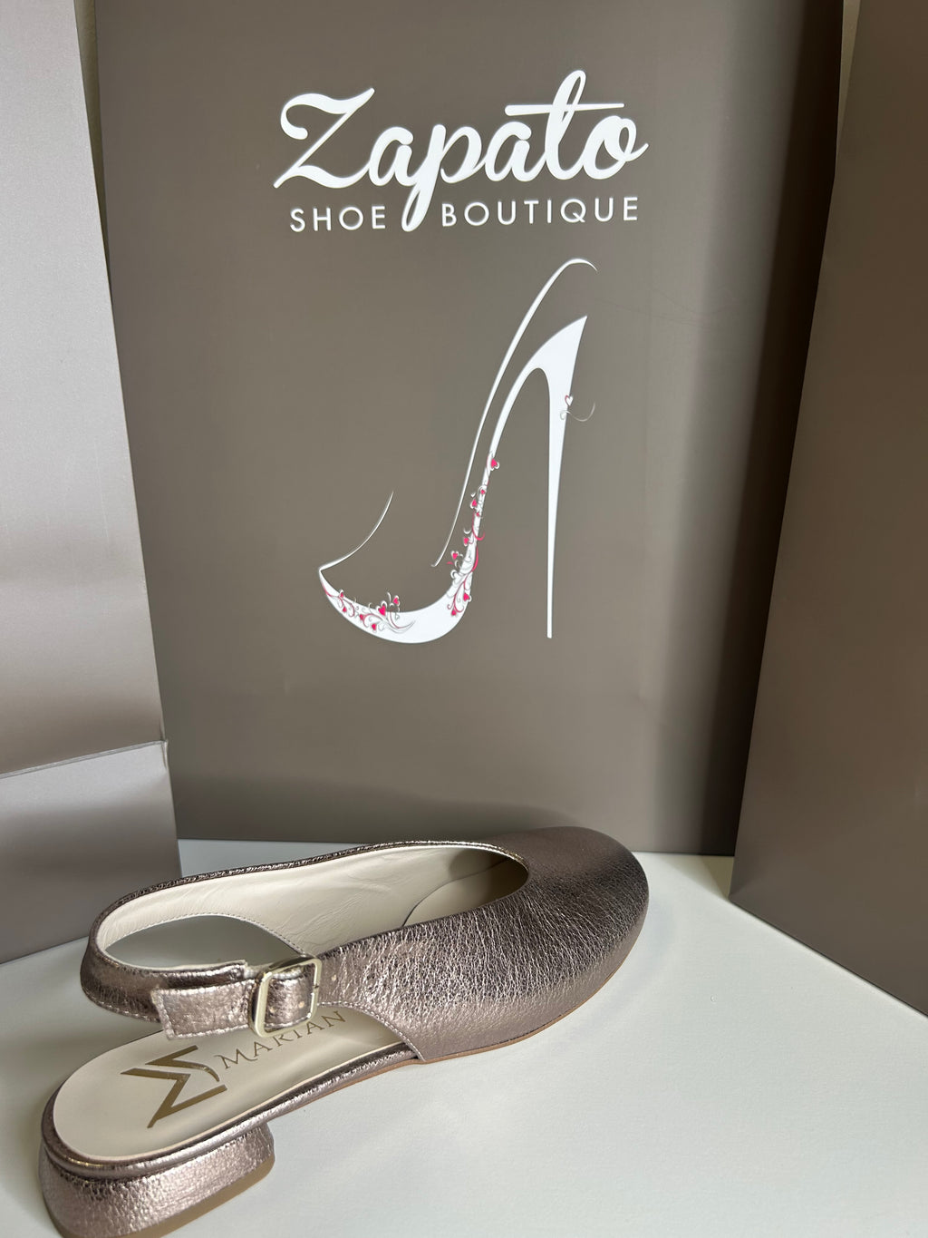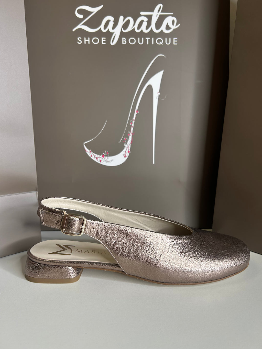 This is beautiful Slingback flat shoe is stylish and has a very comfortable soft gel sole.